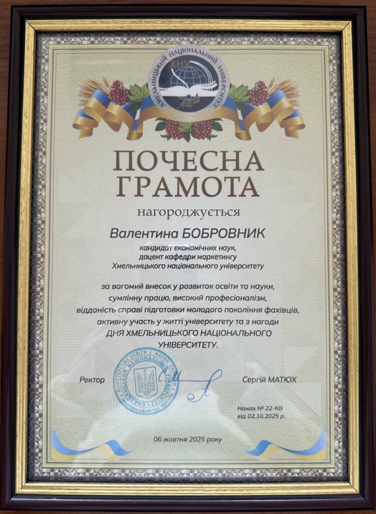 20 жовтня 2025 року доцент кафедри маркетингу Бобровник Валентина Мирославівна була відзначена Грамотою за вагомий внесок у розвиток освіти і науки, сумлінну працю, високий професіоналізм та відданість справі підготовки молодого покоління фахівців.