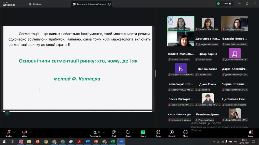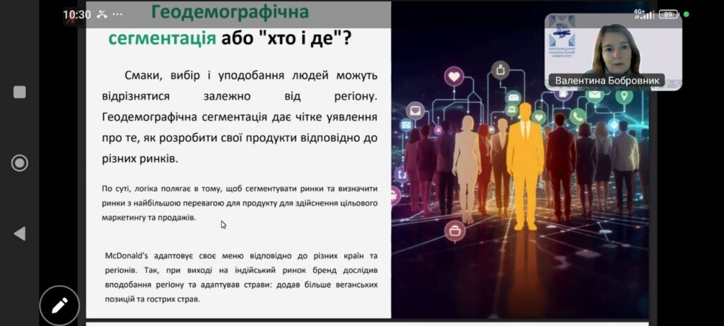 ✔2 грудня 2025 року в рамках партнерства та розвитку внутрішньої академічної мобільності з Білоцерківським національним аграрним університетом було проведено бінарну лекцію з дисципліни «Маркетинг» на тему «Сутність і значення сегментації ринку. Цільовий ринок та методи його визначення». Лекцію провели д.е.н., професор Варченко Ольга Миронівна та к.е.н., доцент Бобровник Валентина Мирославівна.
