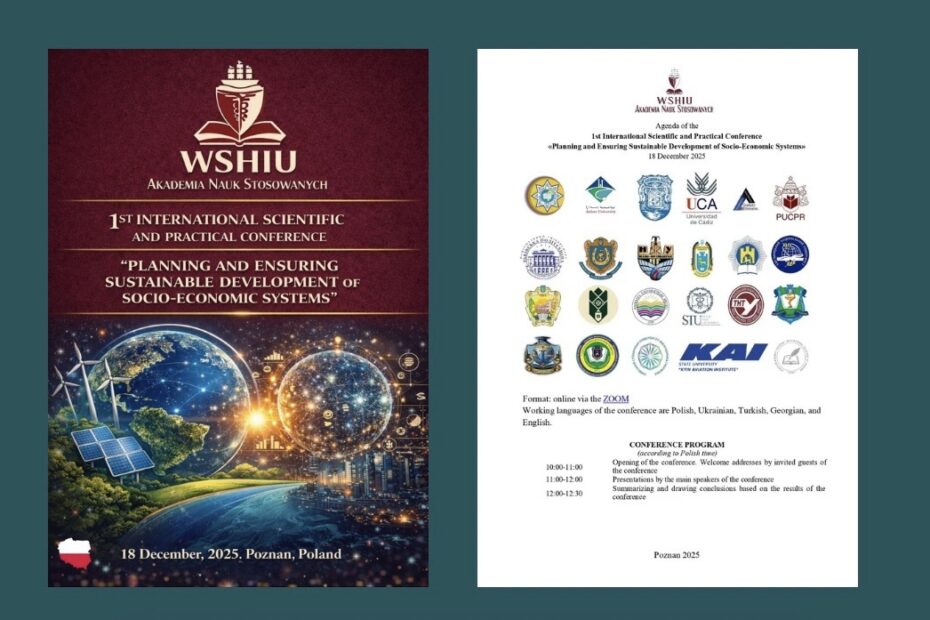 18 грудня 2025 р. на базі WSHIU Akademia Nauk Stosowanych (Познань, Польща) відбулася 1-ша Міжнародна науково-практична конференція «Planning and Ensuring… Читати далі »Участь у I МНПК «Planning and Ensuring Sustainable Development of Socio-Economic Systems», (Познань, Польща)