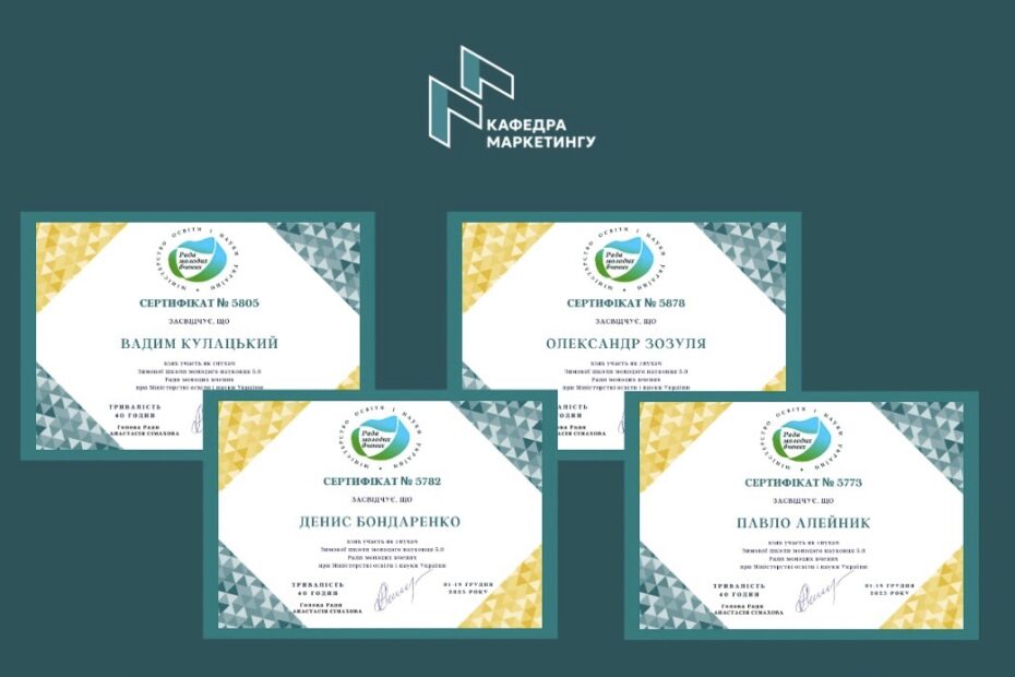 Здобувачі третього (наукового) рівня вищої освіти спеціальності «Маркетинг» Павло АЛЕЙНИК, Денис БОНДАРЕНКО, Вадим КУЛАЦЬКИЙ, Олександр ЗОЗУЛЯ прийняли участь в Зимовій школі молодого науковця… Читати далі »Участь аспірантів в Зимовій школі молодого науковця 5.0
