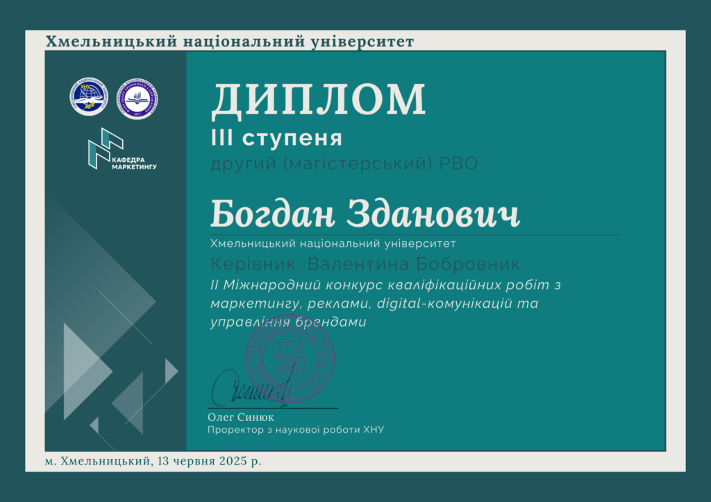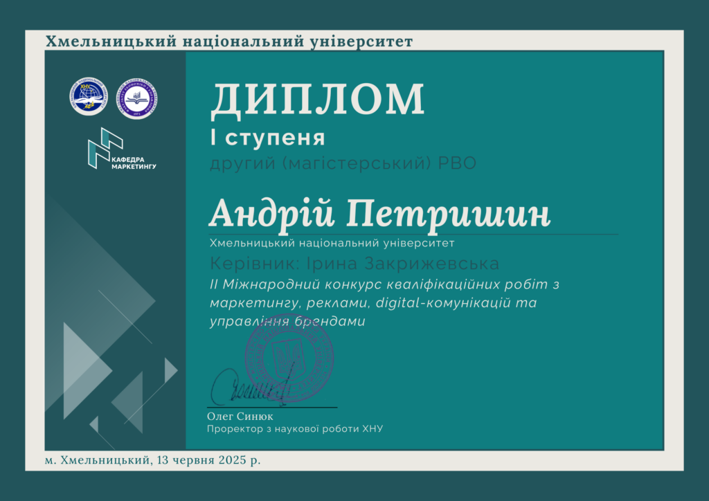 ✔Від бакалавра до магістра – кожен рівень освіти формує не лише знання, а й здатність мислити стратегічно. І саме це підтвердили наші магістри на II Міжнародному конкурсі кваліфікаційних робіт у галузі маркетингу, реклами, цифрових комунікацій та управління брендами: 1 місце – Петришин Андрій (МРм-23-1), 3 місце – Зданович Богдан (МРм-23-1). Ці здобутки свідчать про високий професійний рівень магістрів і демонструють їх реальну практичну цінність і спрямованість (https://mr.khmnu.edu.ua/ogoloshennya-rezultativ-ii-mizhnarodnogo-konkursu-kvalifikaczijnyh-robit/).