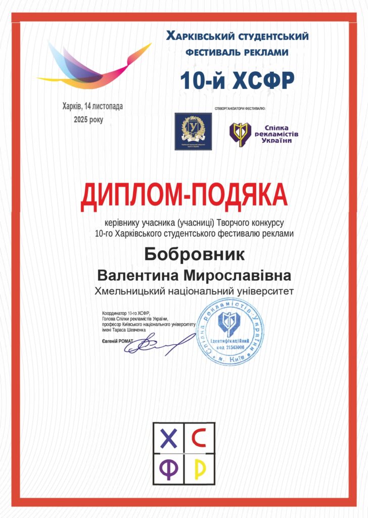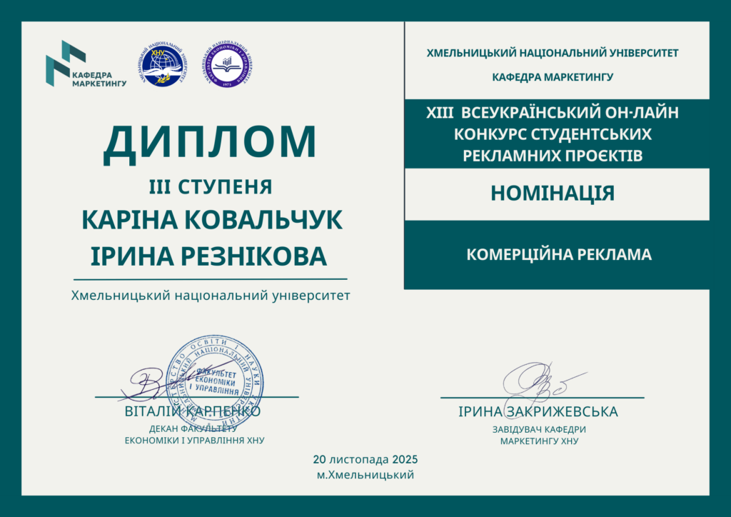 ✔ХІІІ Всеукраїнський он-лайн конкурс студентських рекламних проєктів 2025 показав: наші маркетологи не просто створюють ідеї – вони вміють втілювати їх так, щоб реклама працювала, вражала і запам’ятовувалась, володіють не лише креативним мисленням, а й практичними навичками створення ефективних комунікацій. Їхні проєкти поєднали ідею, стратегію та візуальну подачу, перетворивши рекламу на потужний інструмент впливу, який формує бренд, викликає емоції та залишається в пам’яті споживачів (https://mr.khmnu.edu.ua/hiii-vseukrayinskyj-on-lajn-konkurs-studentskyh-reklamnyh-proyektiv-2025/).