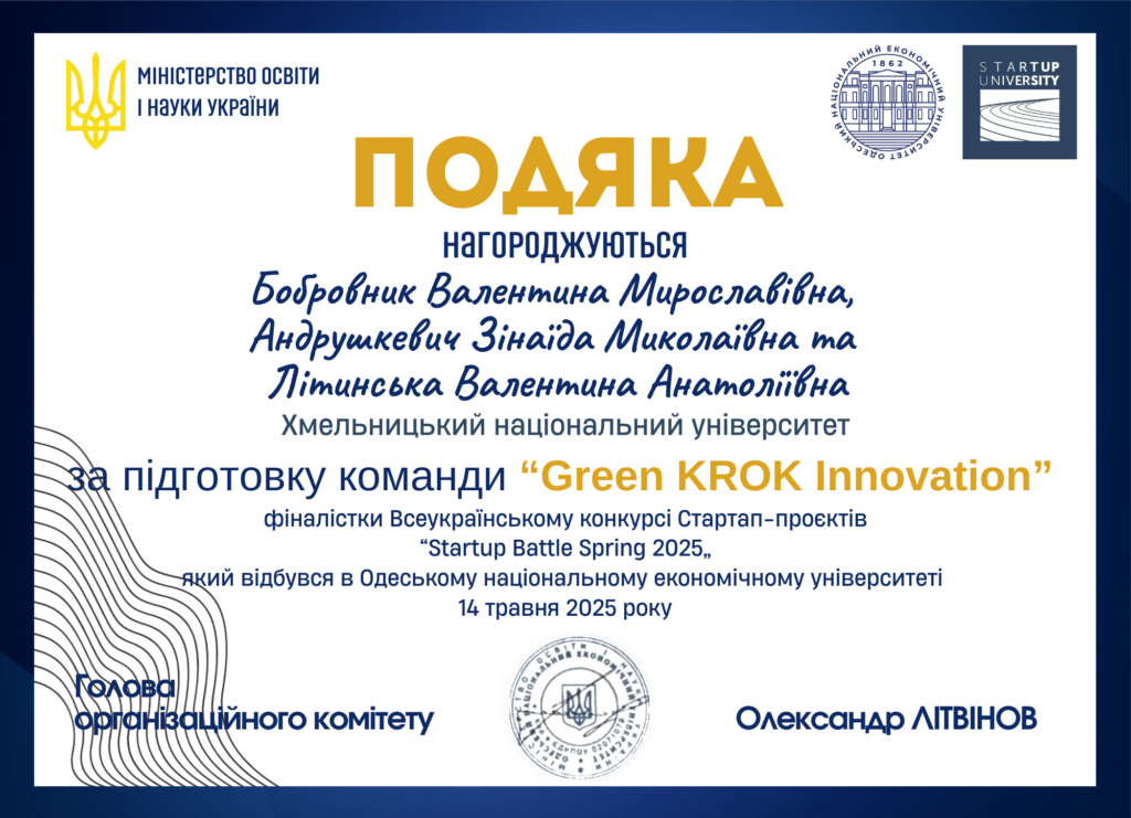 ✔Ідея, яка поєднує стиль і турботу про планету, перетворилася на стартап Green KROK Innovation. Проєкт об’єднав студентів різних курсів (Владислав Дацишин (МР-23-2), Евеліна Духіна та Денис Никитюк (МР-23-1), Олександра Джуглій, Олексій Жежерун, та Юлія Олексюк (МР-22-1) і був представлений на Всеукраїнському конкурсі Startup Battle Spring 2025. Онлайн-магазин кросівок формує екологічно свідому культуру споживання серед молоді, а оформлення авторського права на власний твір демонструє далекоглядність ідеї та готовність масштабувати інноваційний бізнес уже завтра (https://mr.khmnu.edu.ua/green-krok-innovation-marafon-dovzhynoyu-v-rik/).