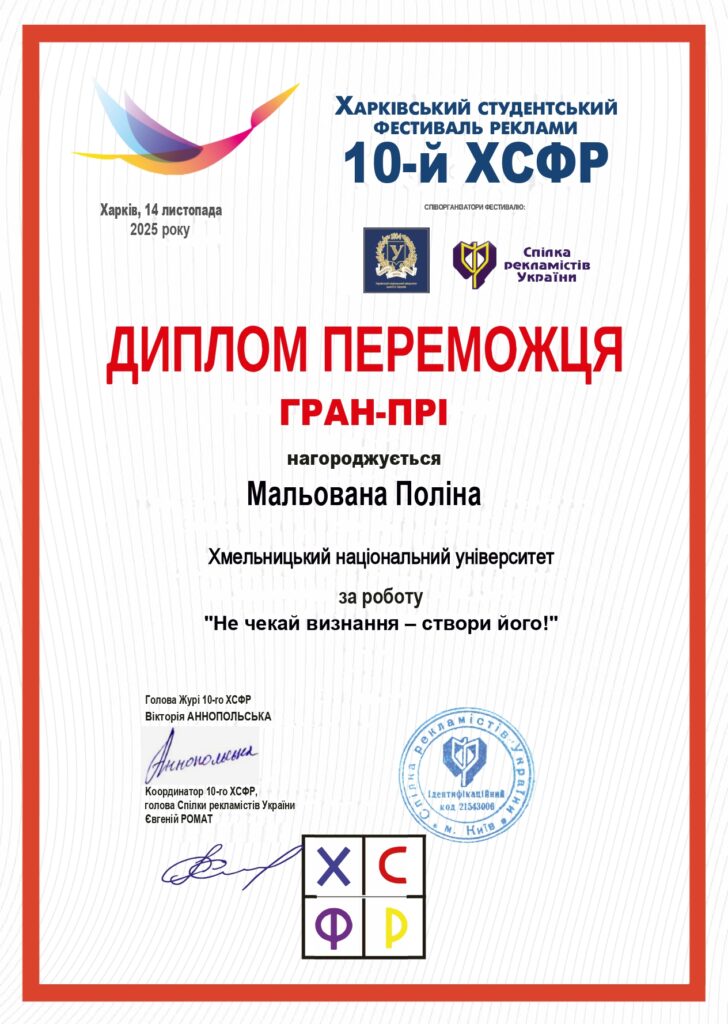 ✔Коли креатив перемагає, на сцену виходять нові зірки реклами! На 10-му Харківському студентському фестивалі Поліна Мальована (МР-24-2) здобула Гран-прі та перші місця у номінаціях «Відеореклама» та «Реклама у форматі TikTok», демонструючи не лише сміливість і нестандартне мислення, а й вміння використовувати сучасні інструменти, включно зі штучним інтелектом, для створення справді інноваційних рекламних рішень (https://mr.khmnu.edu.ua/peremoga-na-x-mu-harkivskomu-studentskomu-festyvali-reklamy/).