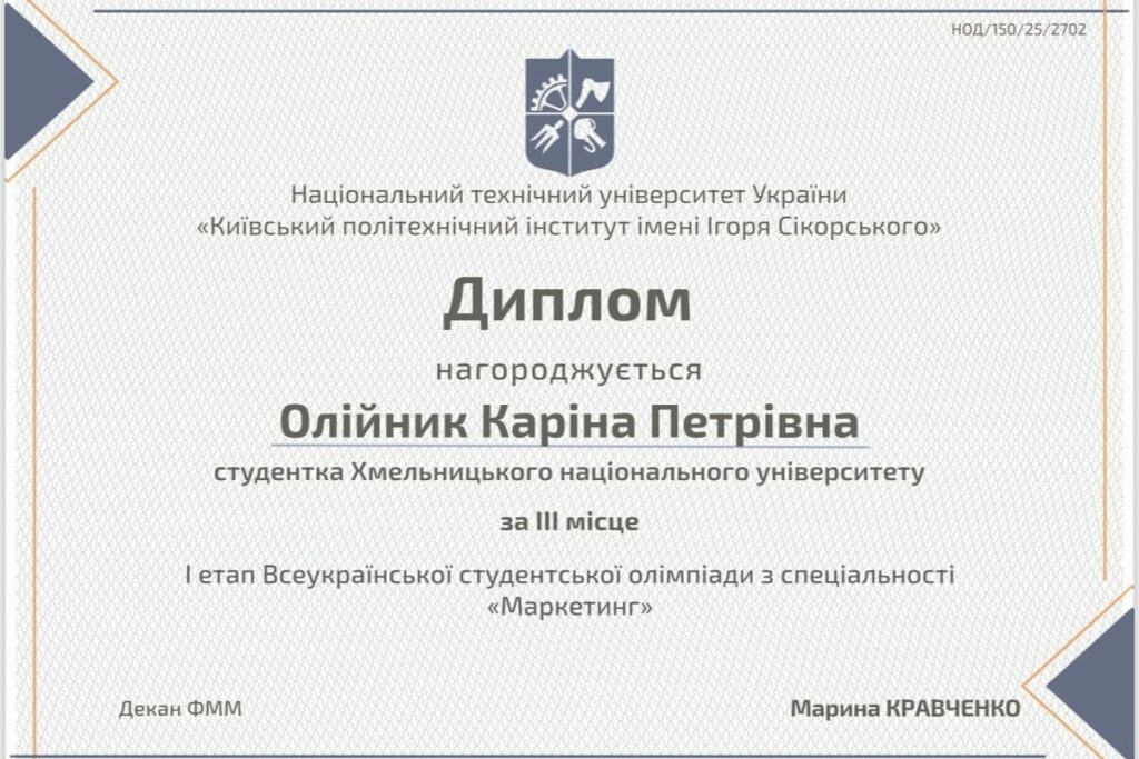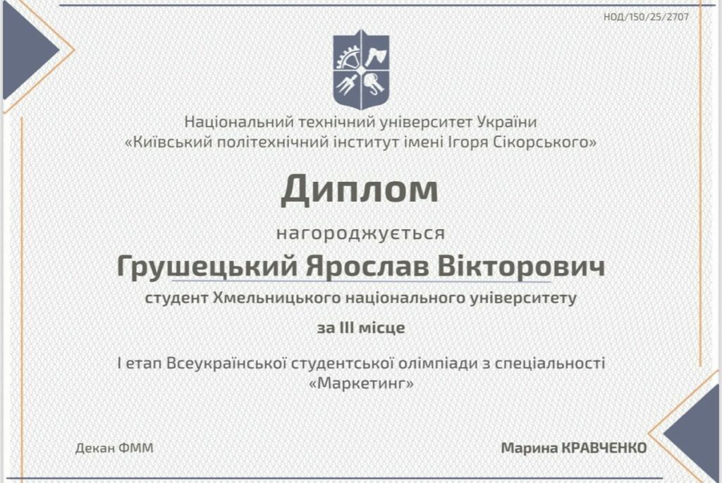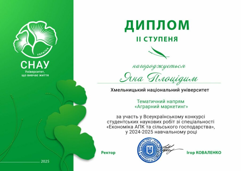 ✔Перемога на Всеукраїнському конкурсі студентських наукових робіт – це більше ніж нагорода. Вона показує, що студентська наука може впливати на розвиток галузі та формує професійні компетенції майбутніх фахівців. Саме цьому досягненню ми завдячуємо Яні Плоцідим (МР-23-1), яка здобула диплом II ступеня у тематичному напрямку «Аграрний маркетинг» (https://mr.khmnu.edu.ua/peremoga-u-vseukrayinskomu-konkursi-studentskyh-naukovyh-robit/).