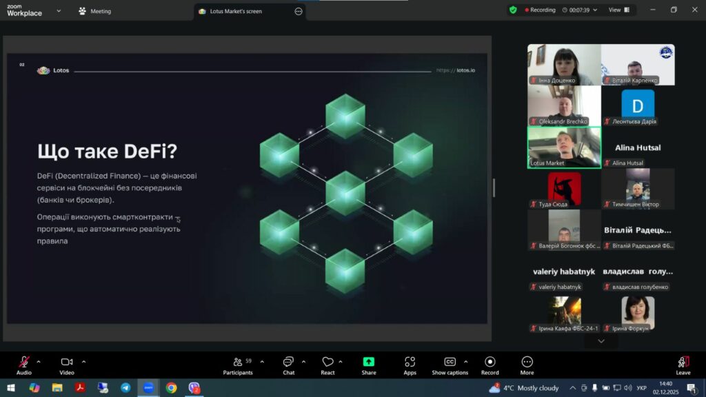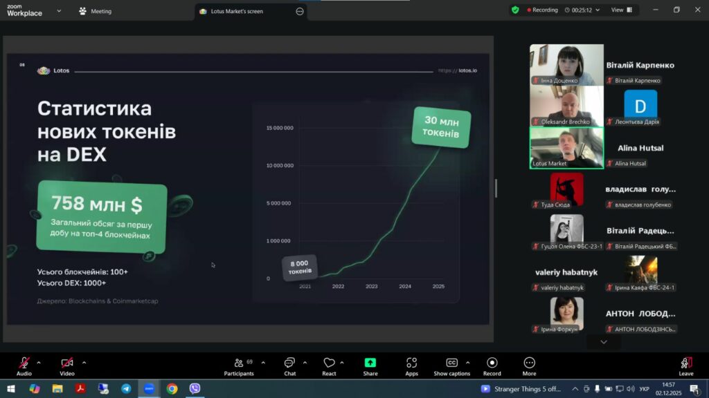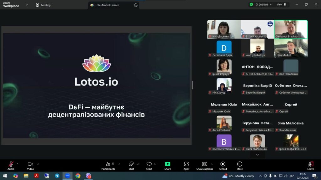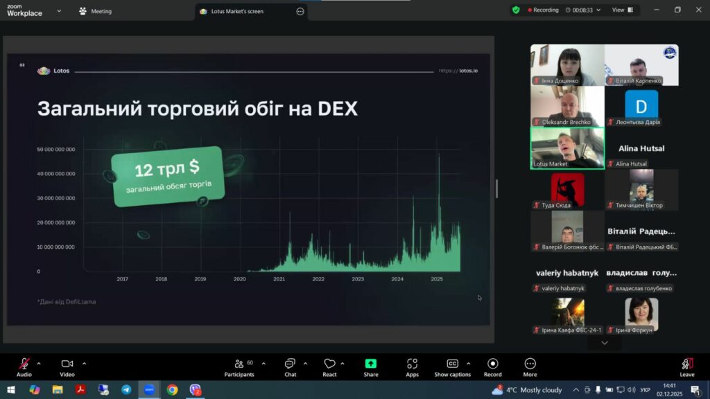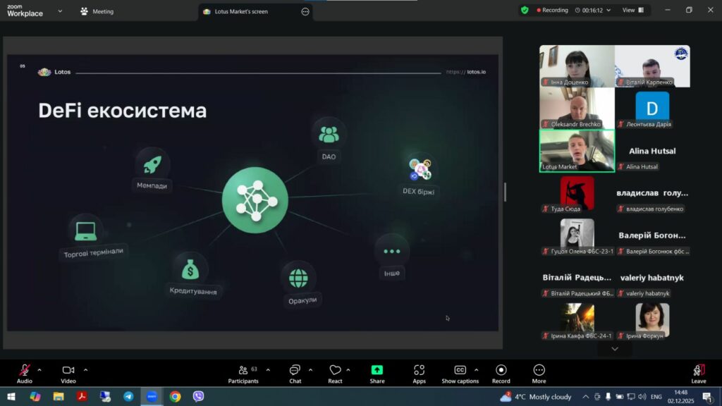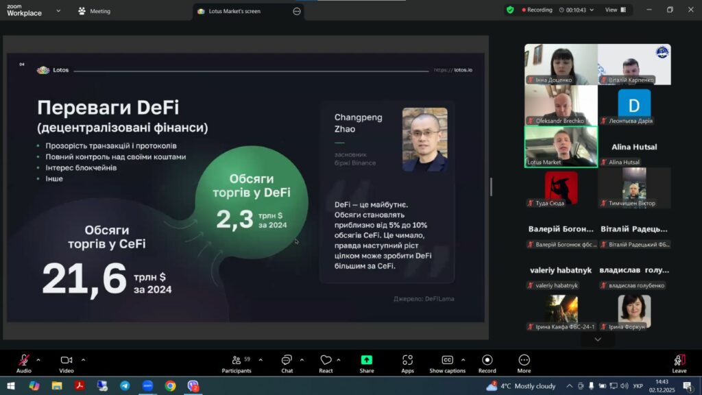 Лектор навів актуальні дані щодо загальної капіталізації ринку DeFi, обсягів ліквідності і домінування провідних блокчейнів, а також наголосив на його ключових ризиках, що стримують розвиток індустрії, зокрема, технічні вразливості смарт-контрактів (злам протоколів і втрата ліквідності); регуляторні обмеження та невизначеність; ризики централізації окремих інфраструктурних елементів. Спікер підкреслив важливість розвитку систем, орієнтованих на користувача, та подальше розширення можливостей DeFi у сфері інвестицій і трейдингу. В цьому контексті було представлено ключові розробки та можливості торгової платформи Lotos.io, в рамках якої вирішуються важливі завдання розвитку DeFi індустрії.