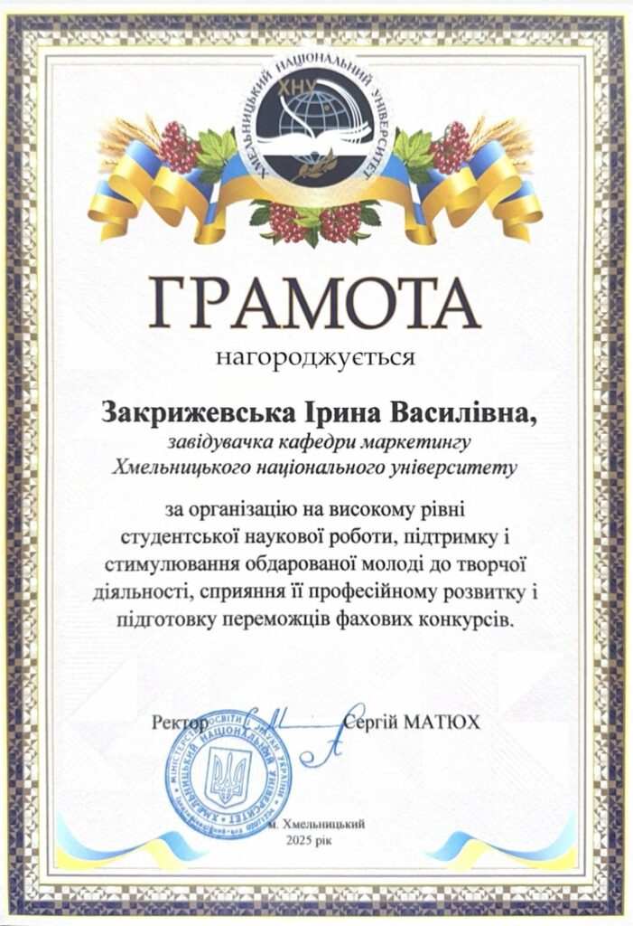 22 вересня 2025 року завідувач кафедри маркетингу, Ірина Закрижевська отримала від ректора грамоту за організацію на високому рівні студентської наукової роботи, підтримку та стимулювання обдарованої молоді до творчої діяльності, сприяння її професійному розвитку та підготовку переможців фахових конкурсів.