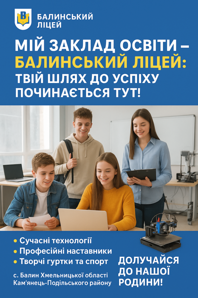 ◾️Балинський ліцей Смотрицької ОТГ Хмельницької області Кам’янець-Подільського району.