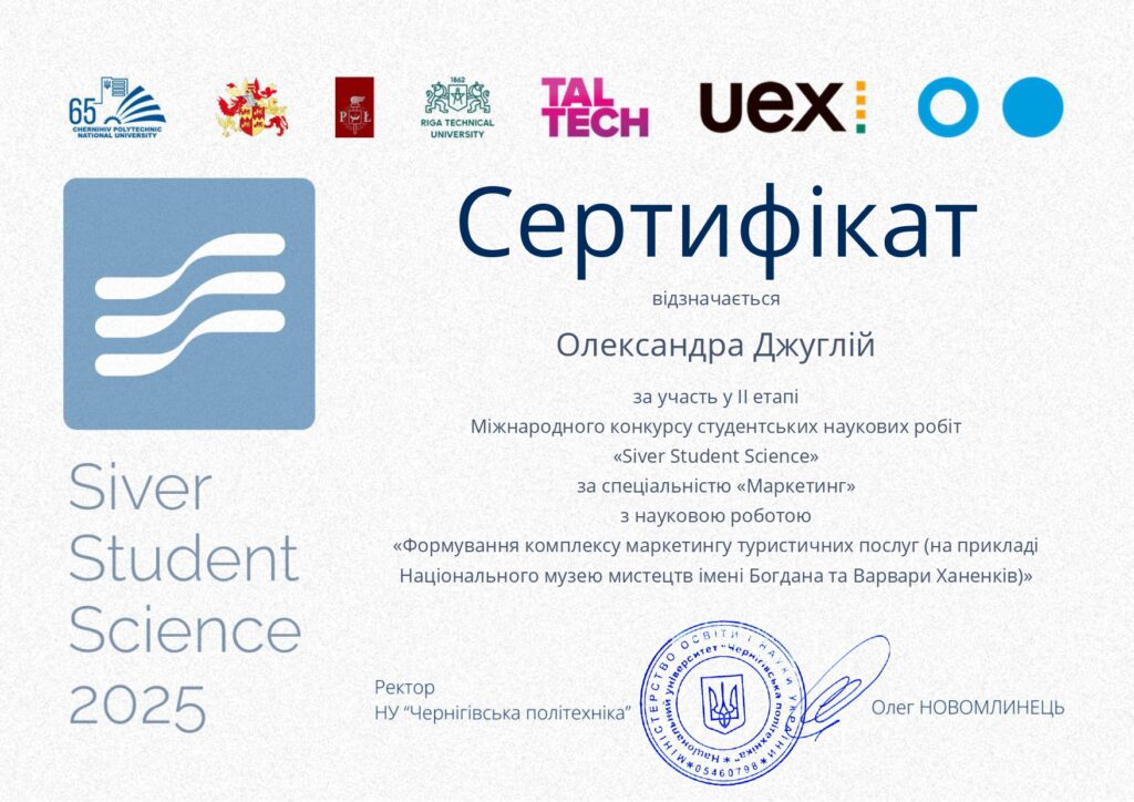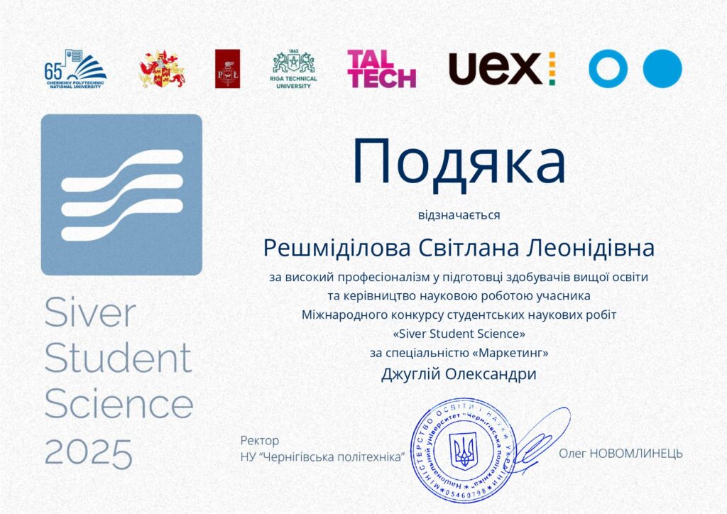 25 жовтня – 2 грудня в Національному університеті «Чернігівська політехніка» відбувся конкурс наукових робіт здобувачів вищої освіти «Siver Student Science» за спеціальністю «Маркетинг».