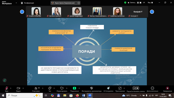 ▪️31 березня 2025 року Ірина Закрижевська, завідувач кафедри маркетингу, виступила спікером вебінару для науково-педагогічних працівників Хмельницького національного університету на тему «Особистий бренд викладача». У тренінгу взяли участь понад 50 осіб.