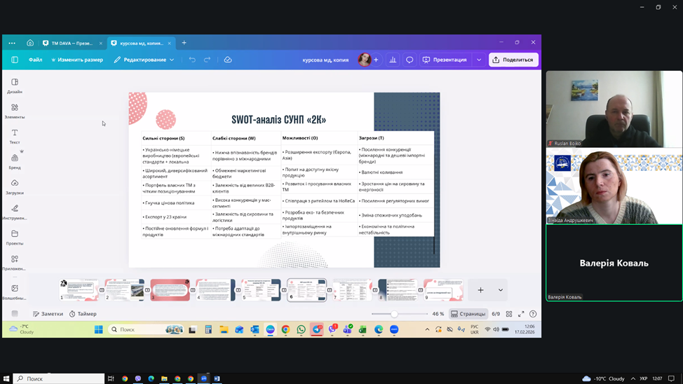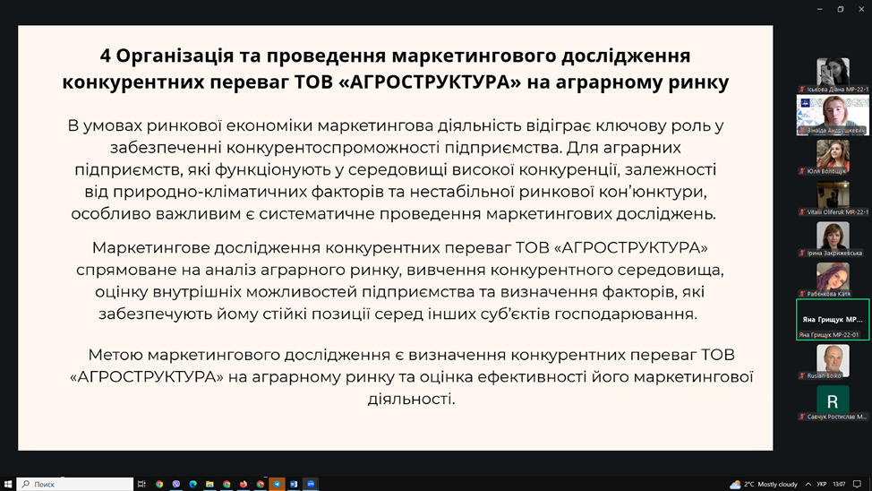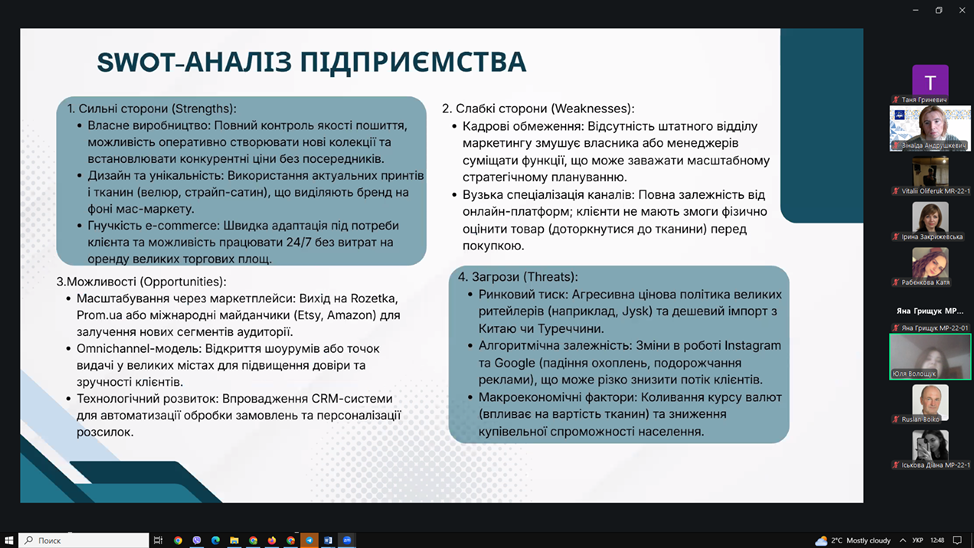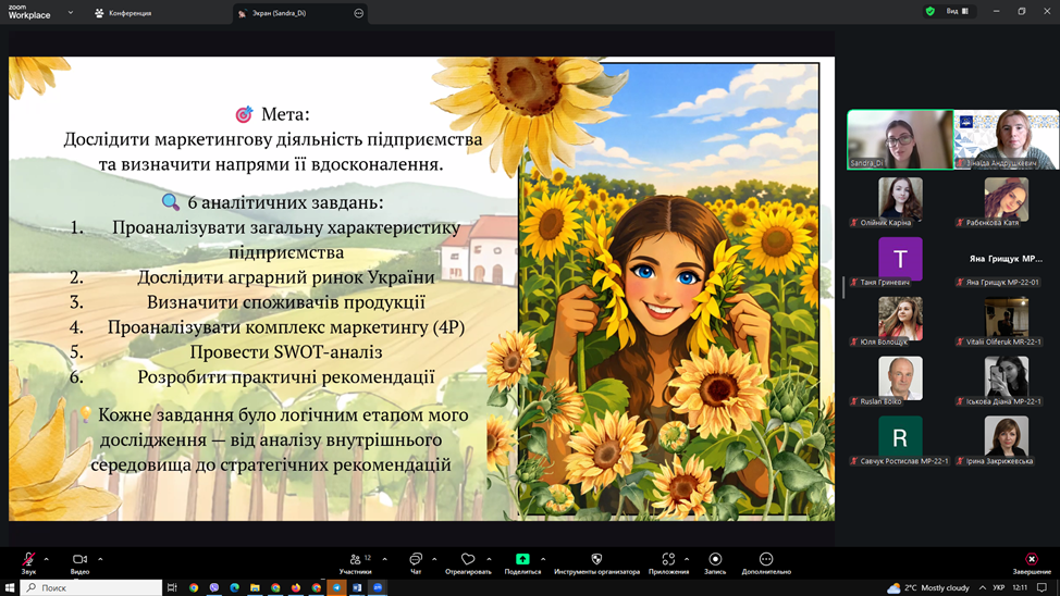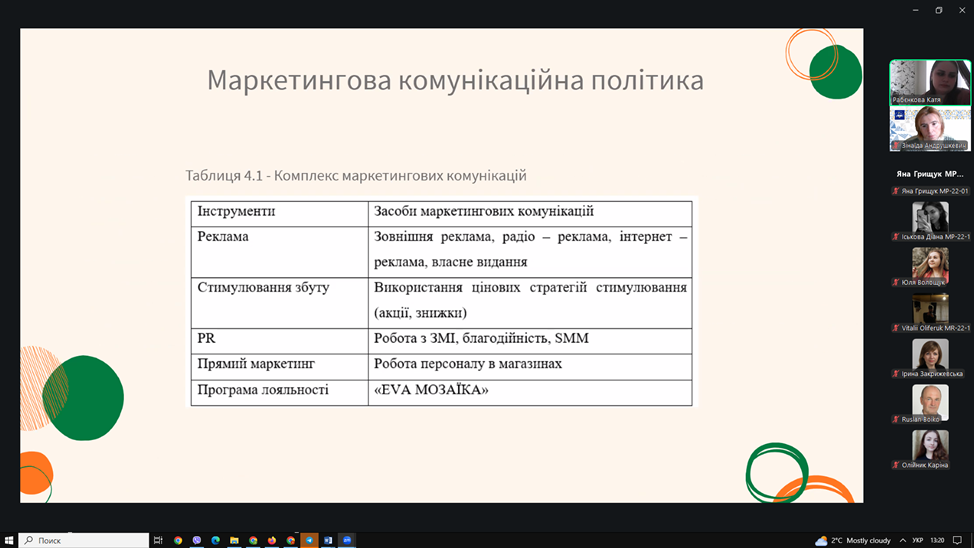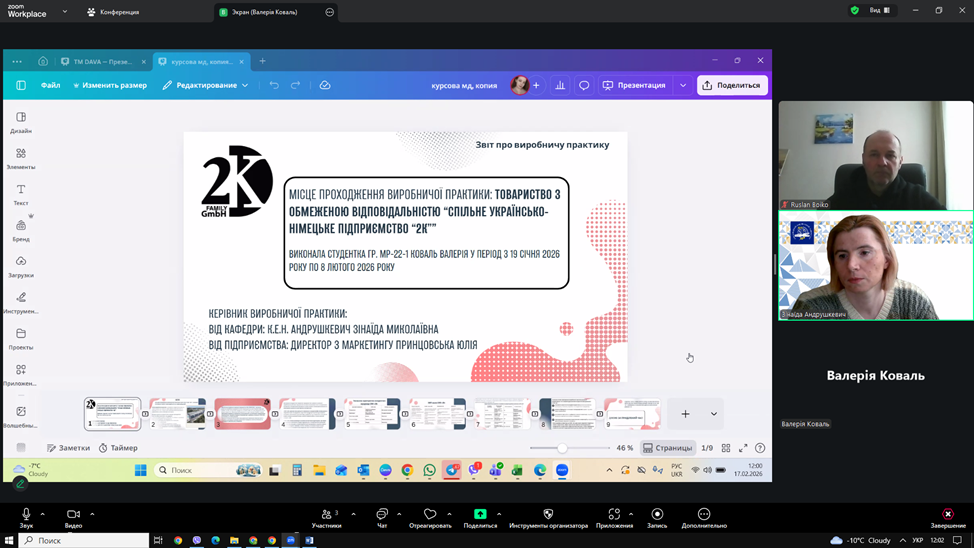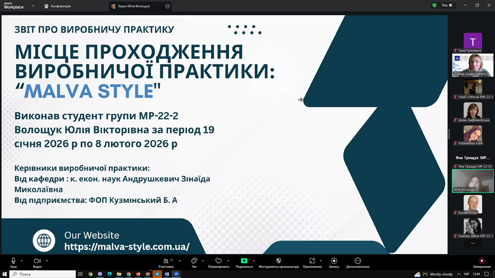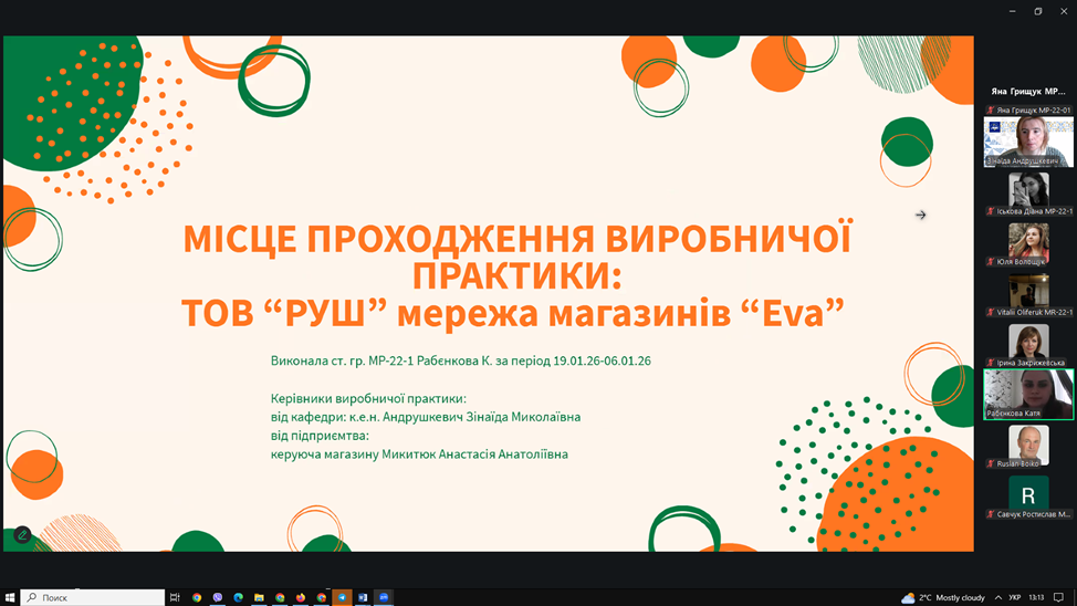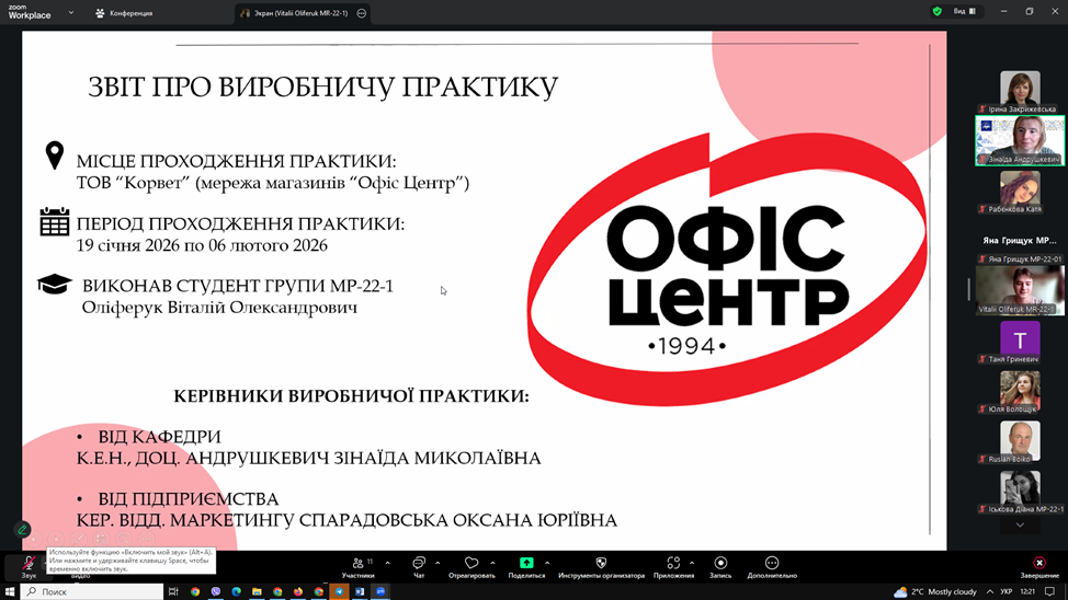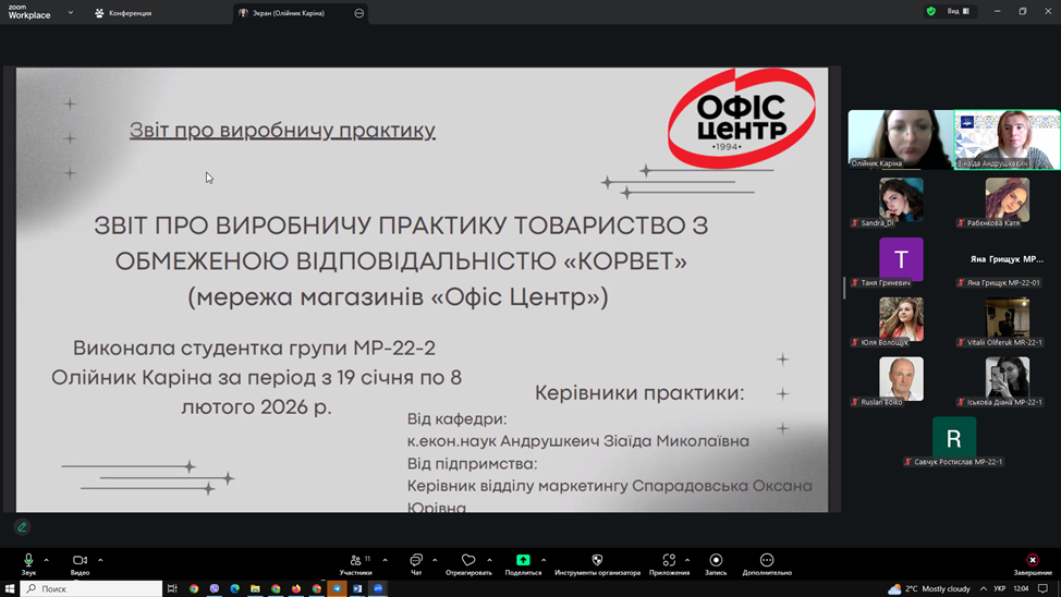 ▪13 лютого 2026 року відбувся захист звітів з виробничої практики. Під час захисту здобувачі представили результати аналізу маркетингової діяльності баз практики, охарактеризували товарну, цінову, збутову та комунікаційну політику підприємств, дослідили використання цифрових інструментів маркетингу та запропонували напрями вдосконалення діяльності.